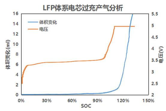 可在充放电过程中实时监控产气体积变化情况,LFP体系电芯在过充实验中,体积随着电池充电过程进行变化,可以看出过充时产气的拐点位置。