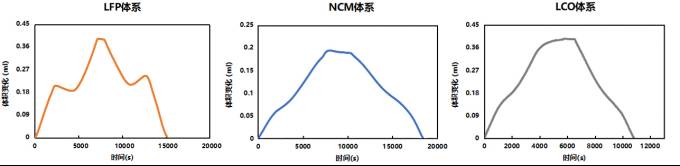 三款不同体系电芯的体积变化曲线,结合正负极材料脱嵌锂相变分析各体积变化曲线的差异,其中LFP体系电芯在充放电过程中会出现“驼峰”的现象,而LCO和NCM体系则没有该现象,且NCM电芯在充电恒压阶段会出现体积稍微减小的趋势。这些体积变化现象的差异对比,一方面能为锂电研发人员提供一种原位表征电芯体积膨胀性能的方法,另一方面也能为研究特定体系电芯的体积膨胀性能时提供数据机理参考。